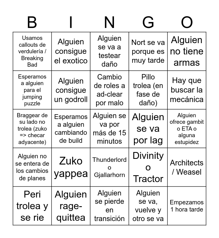 This bingo card has a free space and 24 words: Zuko yappea, Alguien rage-quittea, Cambio de roles a ad-clear por malo, Peri trolea y se rie, Alguien no tiene armas, Usamos callouts de verdulería / Breaking Bad, Esperamos a alguien para el jumping puzzle, Alguien consigue el exotico, Alguien se va por lag, Thunderlord o Gjallarhorn, Pillo trolea (en fase de daño), Braggear de su lado no trolea (zuko => checar adyacente), Divinity o Tractor, Architects / Weasel, Alguien consigue un godroll, Alguien se va, vuelve y otro se va, Alguien ofrece gambit o ETA o alguna estupidez, Alguien se va a testear daño, Hay que buscar la mecánica, Esperamos a alguien cambiando de build, Empezamos 1 hora tarde, Alguien no se entera de los cambios de planes, Nort se va porque es muy tarde and Alguien se pierde en transición.