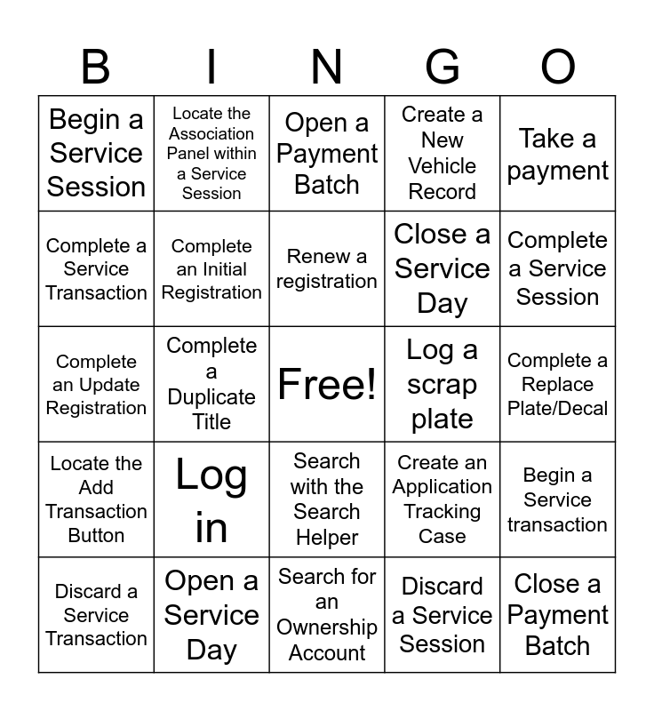 This bingo card has a free space and 24 words: Log in, Open a Service Day, Renew a registration, Discard a Service Transaction, Take a payment, Begin a Service Session, Complete a Service Transaction, Locate the Association Panel within a Service Session, Log a scrap plate, Search with the Search Helper, Close a Service Day, Complete an Update Registration, Create an Application Tracking Case, Begin a Service transaction, Complete an Initial Registration, Discard a Service Session, Complete a Replace Plate/Decal, Open a Payment Batch, Complete a Service Session, Complete a Duplicate Title, Close a Payment Batch, Locate the Add Transaction Button, Create a New Vehicle Record and Search for an Ownership Account.