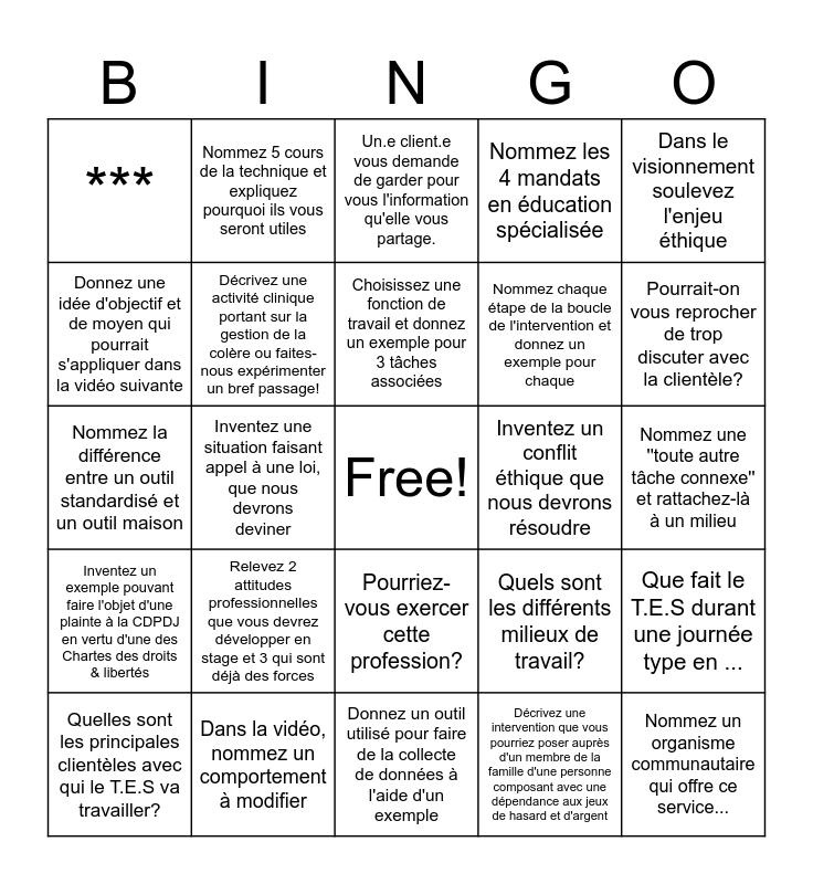 This bingo card has a free space and 24 words: Relevez 2 attitudes professionnelles que vous devrez développer en stage et 3 qui sont déjà des forces, Dans la vidéo, nommez un comportement à modifier, Choisissez une fonction de travail et donnez un exemple pour 3 tâches associées, Quelles sont les principales clientèles avec qui le T.E.S va travailler?, Dans le visionnement soulevez l'enjeu éthique, ***, Donnez une idée d'objectif et de moyen qui pourrait s'appliquer dans la vidéo suivante, Nommez 5 cours de la technique et expliquez pourquoi ils vous seront utiles, Inventez un conflit éthique que nous devrons résoudre, Pourriez-vous exercer cette profession?, Nommez chaque étape de la boucle de l'intervention et donnez un exemple pour chaque, Nommez la différence entre un outil standardisé et un outil maison, Quels sont les différents milieux de travail?, Que fait le T.E.S durant une journée type en ..., Décrivez une activité clinique portant sur la gestion de la colère ou faites-nous expérimenter un bref passage!, Décrivez une intervention que vous pourriez poser auprès d'un membre de la famille d'une personne composant avec une dépendance aux jeux de hasard et d'argent, Nommez une ''toute autre tâche connexe'' et rattachez-là à un milieu, Un.e client.e vous demande de garder pour vous l'information qu'elle vous partage., Pourrait-on vous reprocher de trop discuter avec la clientèle?, Inventez une situation faisant appel à une loi, que nous devrons deviner, Nommez un organisme communautaire qui offre ce service..., Inventez un exemple pouvant faire l'objet d'une plainte à la CDPDJ en vertu d'une des Chartes des droits & libertés, Nommez les 4 mandats en éducation spécialisée and Donnez un outil utilisé pour faire de la collecte de données à l'aide d'un exemple.