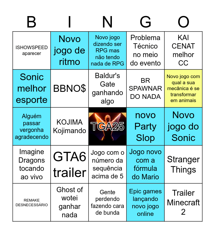 This bingo card has a free space and 24 words: GTA6 trailer, Ghost of wotei ganhar nada, Baldur's Gate ganhando algo, REMAKE DESNECESSÁRIO, KAI CENAT melhor CC, ISHOWSPEED aparecer, Sonic melhor esporte, Novo jogo de ritmo, novo Party Slop, Jogo com o número da sequência acima de 5, BR SPAWNAR DO NADA, Alguém passar vergonha agradecendo, Jogo novo com a fórmula do Mario, Stranger Things, BBNO$, Epic games lançando novo jogo online, Novo jogo do Sonic, Novo jogo dizendo ser RPG mas não tendo nada de RPG, Novo jogo com qual a sua mecânica é se transformar em animais, KOJIMA Kojimando, Trailer Minecraft 2, Imagine Dragons tocando ao vivo, Problema Técnico no meio do evento and Gente perdendo fazendo cara de bunda.