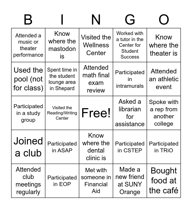 This bingo card has a free space and 36 words: Visited the Math Lab, Met with a Pathway Coach, Attended a lecture outside of class time, Spent time in the student lounge area in Shepard, Participated in CSTEP, Joined a club, Attended math final exam review, Participated in Student Life Day, Know where the theater is, Attended a career services event, Visited the Reading/Writing Center, Worked with a tutor in the Center for Student Success, Worked with a tutor through NetTutor, Asked a librarian for assistance, Attended an athletic event, Attended a music or theater performance, Visited a faculty member in their office, Participated in ASAP, Bought food at the café, Visited the Wellness Center, Spoke with a rep from another college, Participated in TRiO, Participated in EOP, Attended club meetings regularly, Met with someone in Financial Aid, Know where the mastodon is, Participated in a study group, Attended the transfer fair, Participated in intramurals, Used the pool (not for class), Used the weight room (not for class), Know where the security office is, Made a new friend at SUNY Orange, Know where the dental clinic is, Checked your grades on Brightspace and Asked a question in Student Services.