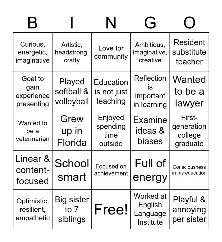 This bingo card has 31 words: Free!, Adequate understanding of essentialism, Grew up in Florida, Wanted to be an artist, Curious, energetic, imaginative, Love for community, Played softball & volleyball, Full of energy, Examine ideas & biases, Worked at English Language Institute, First-generation college graduate, Enjoyed spending time outside, Playful & annoying per sister, Wanted to become a baker, Wanted to be a lawyer, Natural leadership ability, Consciousness in my education, School smart, Linear & content-focused, Focused on achievement, Resident substitute teacher, Selfless & fearless, Optimistic, resilient, empathetic, Artistic, headstrong, crafty, Reflection is important in learning, Goal to gain experience presenting, Ambitious, imaginative, creative, Wanted to be a veterinarian, Big sister to 7 siblings, Education is not just teaching and Curious about other cultures.