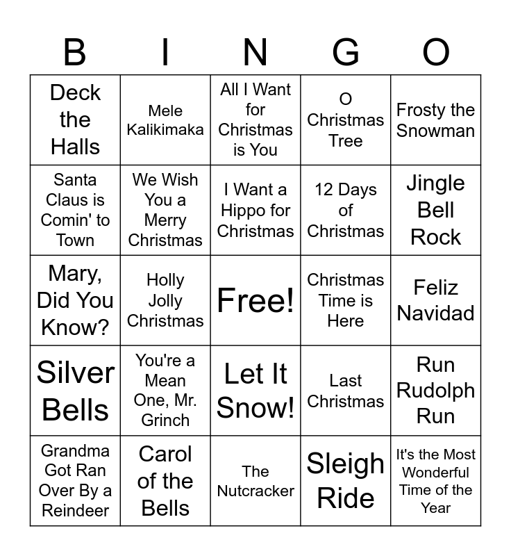 This bingo card has a free space and 24 words: You're a Mean One, Mr. Grinch, Carol of the Bells, I Want a Hippo for Christmas, Grandma Got Ran Over By a Reindeer, Frosty the Snowman, Deck the Halls, Santa Claus is Comin' to Town, Mele Kalikimaka, Christmas Time is Here, Let It Snow!, 12 Days of Christmas, Mary, Did You Know?, Last Christmas, Run Rudolph Run, We Wish You a Merry Christmas, Sleigh Ride, Feliz Navidad, All I Want for Christmas is You, Jingle Bell Rock, Holly Jolly Christmas, It's the Most Wonderful Time of the Year, Silver Bells, O Christmas Tree and The Nutcracker.