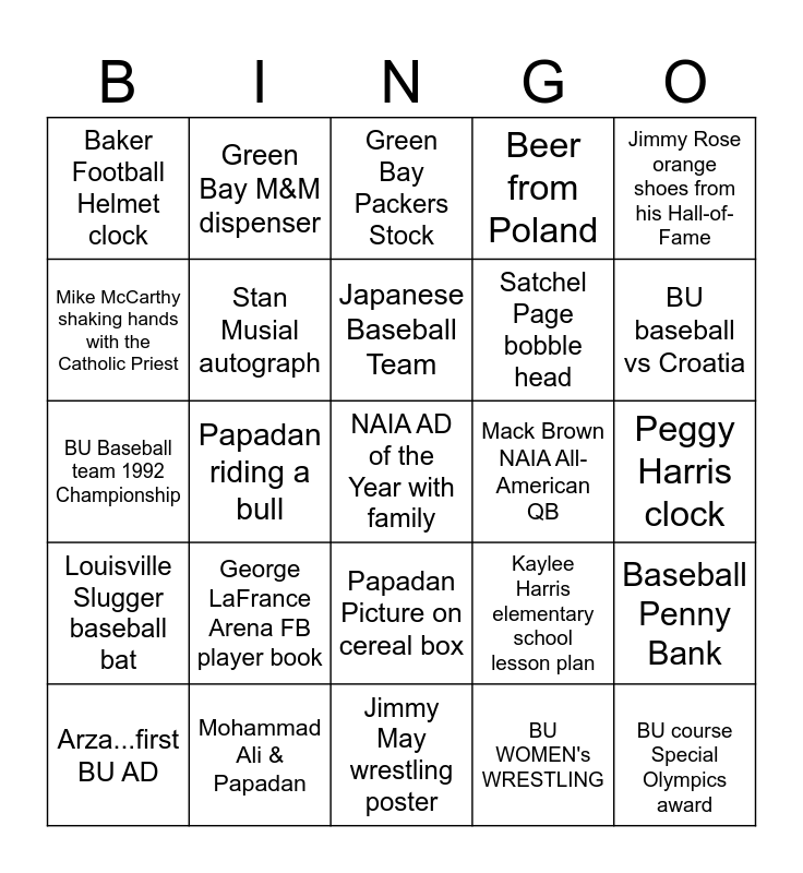 This bingo card has 30 words: Mohammad Ali & Papadan, BU Baseball Team in Hawaii, Papadan riding a bull, Elephant Painting, Baker Football Helmet clock, Green Bay Packers Stock, Stan Musial autograph, Papadan Picture on cereal box, Mack Brown NAIA All-American QB, Jimmy May wrestling poster, Peggy Harris clock, NAIA AD of the Year with family, BU WOMEN's WRESTLING, BU course Special Olympics award, BU baseball vs Croatia, Charlie Richard memorial coin, Kaylee Harris elementary school lesson plan, Louisville Slugger baseball bat, George LaFrance Arena FB player book, Jimmy Rose orange shoes from his Hall-of-Fame, BU Baseball team 1992 Championship, Super Bowl Tickets (Packers vs Steelers), Green Bay M&M dispenser, Satchel Page bobble head, Mike McCarthy shaking hands with the Catholic Priest, Beer from Poland, Baseball Penny Bank, Arza...first BU AD, Japanese Baseball Team and Kit Harris Cael Sanderson Cael Harris.