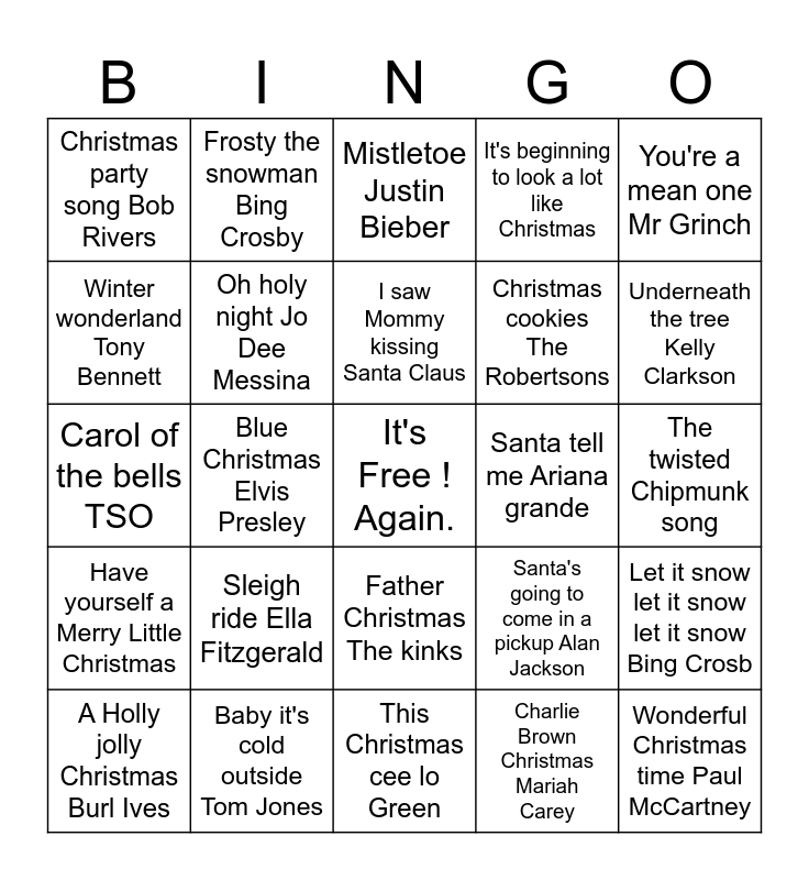 This bingo card has a free space and 26 words: Father Christmas The kinks, Charlie Brown Christmas Mariah Carey, I saw Mommy kissing Santa Claus, Baby it's cold outside Tom Jones, You're a mean one Mr Grinch, Christmas party song Bob Rivers, Winter wonderland Tony Bennett, Frosty the snowman Bing Crosby, The twisted Chipmunk song, Santa's going to come in a pickup Alan Jackson, Christmas cookies The Robertsons, Carol of the bells TSO, Let it snow let it snow let it snow Bing Crosb, A Holly jolly Christmas Burl Ives, Blue Christmas Elvis Presley, Here comes Santa Claus Gene autry, It's beginning to look a lot like Christmas, Have yourself a Merry Little Christmas, Mistletoe Justin Bieber, Wonderful Christmas time Paul McCartney, Underneath the tree Kelly Clarkson, This Christmas cee lo Green, Santa tell me Ariana grande, Sleigh ride Ella Fitzgerald, Oh holy night Jo Dee Messina and I'll be home for Christmas Doris Day.