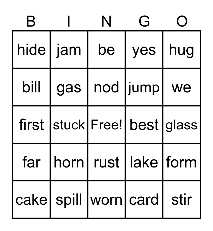 This bingo card has a free space and 29 words: tag, spill, be, job, hug, hide, gas, nod, best, form, cake, stuck, card, stir, first, bike, worn, lake, we, far, horn, rake, jump, glass, bill, jam, rust, yes and drop.