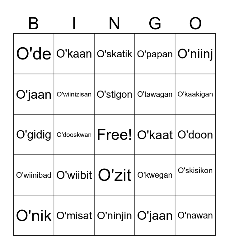 This bingo card has a free space and 24 words: O'wiibit, O'misat, O'stigon, O'nik, O'niinj, O'de, O'jaan, O'kaan, O'kaat, O'zit, O'tawagan, O'gidig, O'kwegan, O'skisikon, O'wiinizisan, O'jaan, O'doon, O'skatik, O'kaakigan, O'dooskwan, O'nawan, O'wiinibad, O'papan and O'ninjin.