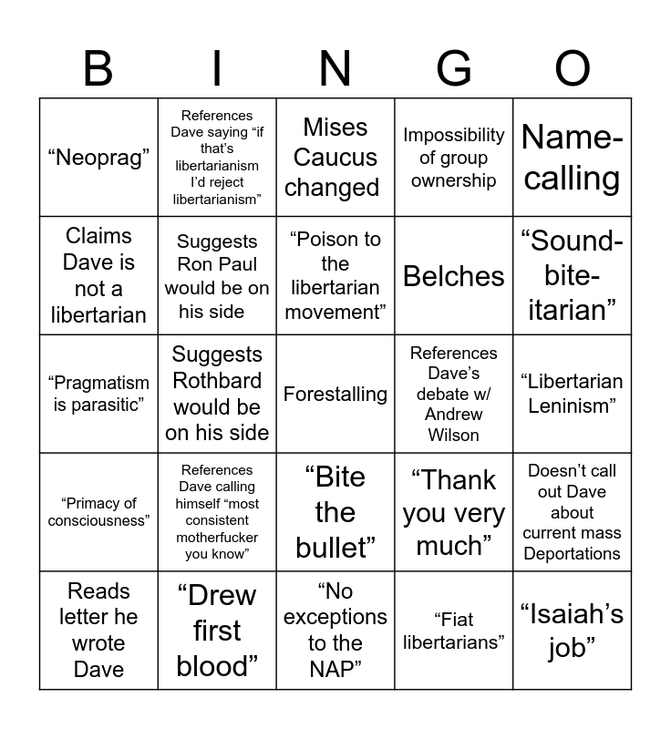 This bingo card has a free space and 24 words: References Dave calling himself “most consistent motherfucker you know”, “Drew first blood”, “Poison to the libertarian movement”, Reads letter he wrote Dave, Name-calling, “Neoprag”, Claims Dave is not a libertarian, References Dave saying “if that’s libertarianism I’d reject libertarianism”, References Dave’s debate w/ Andrew Wilson, “Bite the bullet”, Belches, “Pragmatism is parasitic”, “Thank you very much”, Doesn’t call out Dave about current mass Deportations, Suggests Ron Paul would be on his side, “Fiat libertarians”, “Libertarian Leninism”, Mises Caucus changed, “Sound-bite-itarian”, Suggests Rothbard would be on his side, “Isaiah’s job”, “Primacy of consciousness”, Impossibility of group ownership and “No exceptions to the NAP”.