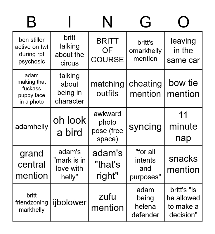 This bingo card has a free space and 24 words: adam's "mark is in love with helly", ijbolower, matching outfits, britt friendzoning markhelly, leaving in the same car, ben stiller active on twt during rpf psychosic, adam making that fuckass puppy face in a photo, britt talking about the circus, syncing, adam's "that's right", cheating mention, adamhelly, "for all intents and purposes", snacks mention, talking about being in character, adam being helena defender, 11 minute nap, BRITT OF COURSE, bow tie mention, oh look a bird, britt's "is he allowed to make a decision", grand central mention, britt's omarkhelly mention and zufu mention.