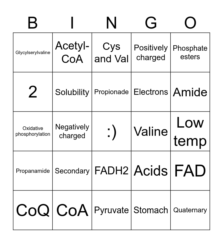 This bingo card has a free space and 36 words: 3-chloroaniline, R-NH2, Weak base/raise, Solubility, Acids, Propanamide, Propionade, Twenty, Phosphate esters, Serine, Negatively charged, Positively charged, Tyrosine, Valine, Amide, Glycylserylvaline, Primary, Secondary, Quaternary, Cys and Val, Low temp, FAD, CoA, CoQ, Pyruvate, Acetyl-CoA, Oxidative phosphorylation, 32, Electrons, 2, Oxygen, Lipases, Stomach, FADH2, O2 and CO2.