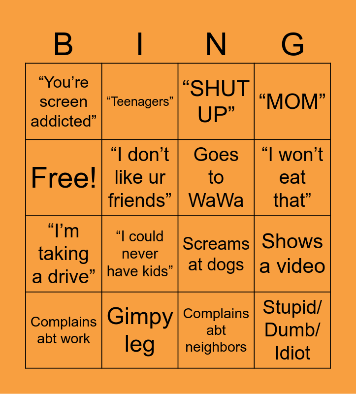 This bingo card has 16 words: Gimpy leg, Shows a video, “SHUT UP”, “You’re screen addicted”, “I’m taking a drive”, “Teenagers”, Screams at dogs, Complains abt neighbors, Free!, “I don’t like ur friends”, Complains abt work, “MOM”, “I could never have kids”, “I won’t eat that”, Goes to WaWa and Stupid/ Dumb/ Idiot.