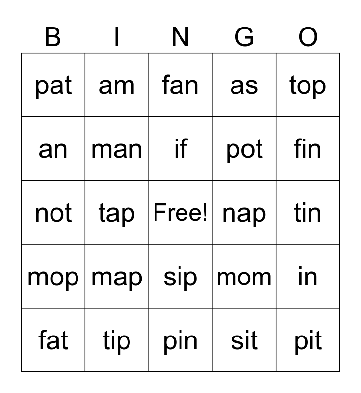 This bingo card has a free space and 29 words: fat, sat, tap, mat, pat, fan, man, map, nap, tip, tin, pit, pin, sit, fin, fit, sip, mop, top, not, mom, pop, pot, an, as, am, in, if and on.