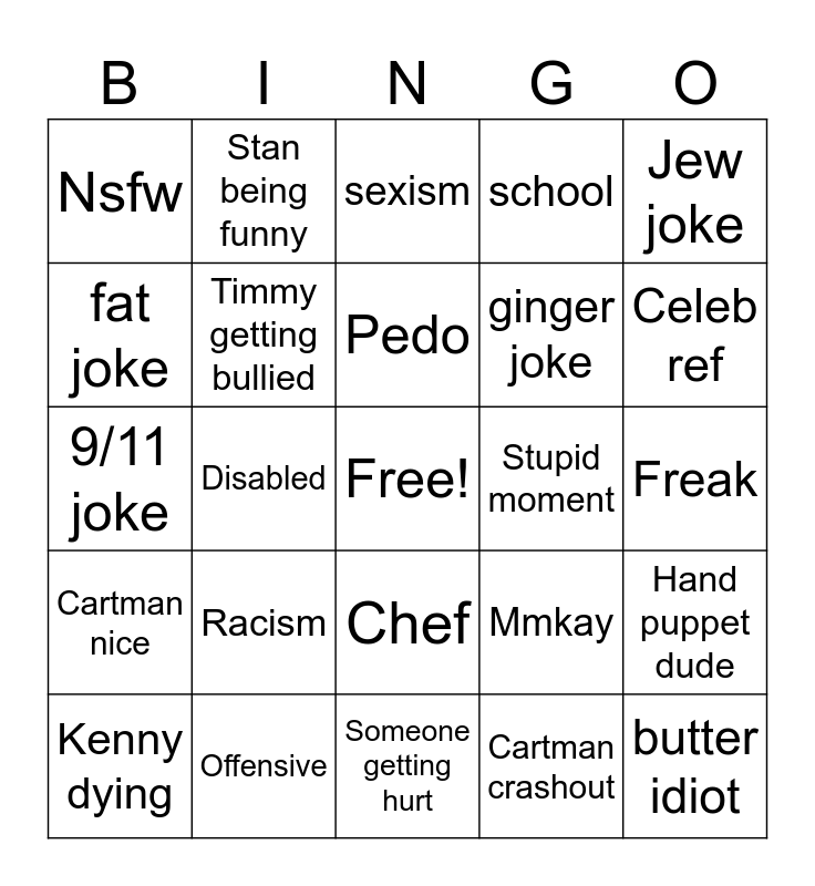 This bingo card has a free space and 24 words: Racism, Offensive, Pedo, Kenny dying, Jew joke, Nsfw, fat joke, Stan being funny, Stupid moment, Chef, ginger joke, 9/11 joke, Mmkay, Hand puppet dude, Timmy getting bullied, Cartman crashout, Freak, sexism, Celeb ref, Disabled, butter idiot, Cartman nice, school and Someone getting hurt.