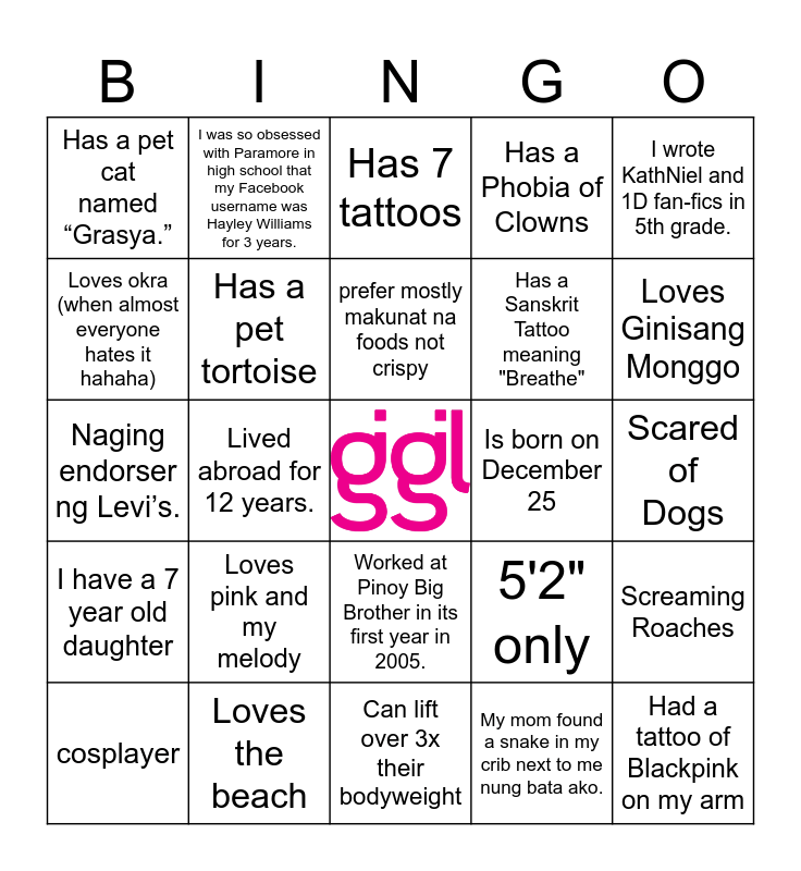 This bingo card has a free space and 86 words: Zodiac sign is Aquarius, Worked on a photoshoot with a Kpop group when they visited the PH, Worked at Pinoy Big Brother in its first year in 2005., Wears white or blue clothing, Watches rap battle videos nonstop, Was almost a session player for Rivermaya, Was able to memorize capitals of some countries at 4 yrs old, Wala na akong appendix, Tondo gurlie, Taught in Xavier before entering advertising., Studied at a film school, Spoke on radio (Magic 89.9), Screaming Roaches, Scared of Dogs, Resources in Management Taking Human Masters, prefer mostly makunat na foods not crispy, Plays volleyball., Only tried Jian Nan once (Second time pa lang on friday), Olivia Rodrigo Fan, NPA in Metro Manila - Lumilipat always sa near sa new work office, Not in my 20s, Night Owl, Naging endorser ng Levi’s., My top artist on Spotify is Lany, My mom found a snake in my crib next to me nung bata ako., Mom of 2, Mobile gamer for 7hrs straight, May blush blindness, Maraming kalyo sa paa, Lumaki sa Nueva Ecija, Loves the beach, Loves Spock from Star Trek, Loves Serial Killer Documentaries, Loves pink and my melody, Loves okra (when almost everyone hates it hahaha), Loves Insects, Loves Ginisang Monggo, Loves cats but only has dogs, Loves any food/drinks with matcha, Lived abroad for 12 years., Listens to twice, kuripot, James Bond Fanatic, Is born on December 25, Introvert (pero ambivert talaga), I wrote KathNiel and 1D fan-fics in 5th grade., I won a small chick from a school fair during grade school, took it home, and we cared for it long enough until it grew to a full-sized chicken (happycry), I was so obsessed with Paramore in high school that my Facebook username was Hayley Williams for 3 years., I was almost named after Rico Yan., I used to own the rarest plant in the world, I once played Sims 4 for 32 hours straight., I have never tried balut, I have a 7 year old daughter, I can sleep anywhere., I am a libero (before), Has phobia riding planes, Has been to Iceland, Has a Sanskrit Tattoo meaning "Breathe", Has a Phobia of Clowns, Has a pet tortoise, Has a pet cat named “Grasya.”, Has a notebook dedicated to his list of good food places., Has a love for vending machines, Has a fake band called, Has a brother named Darwin., Has 7 tattoos, Has 3 kids, Had a tattoo of Blackpink on my arm, Grew up in CDO., First crush is enchong dee, Favorite shape is a star, Diehard Lakers Fan, cosplayer, Cortis stan, Collects vinyl records, Coco Milktea Addict, Can lift over 3x their bodyweight, Bunso, Before college, naging English teacher ako of a Chinese thoracic surgeon., Back in High School, I bought a dog using my lunch money and told my parents na bigay lang siya cause they'll get mad., Ayokong magka-anak, Allergic sa dust at pusa, A Bunso, sa 7th na magkakapatid, 500-day TikTok streak, 5'2" only and ‘Di mahilig sa kakanin.