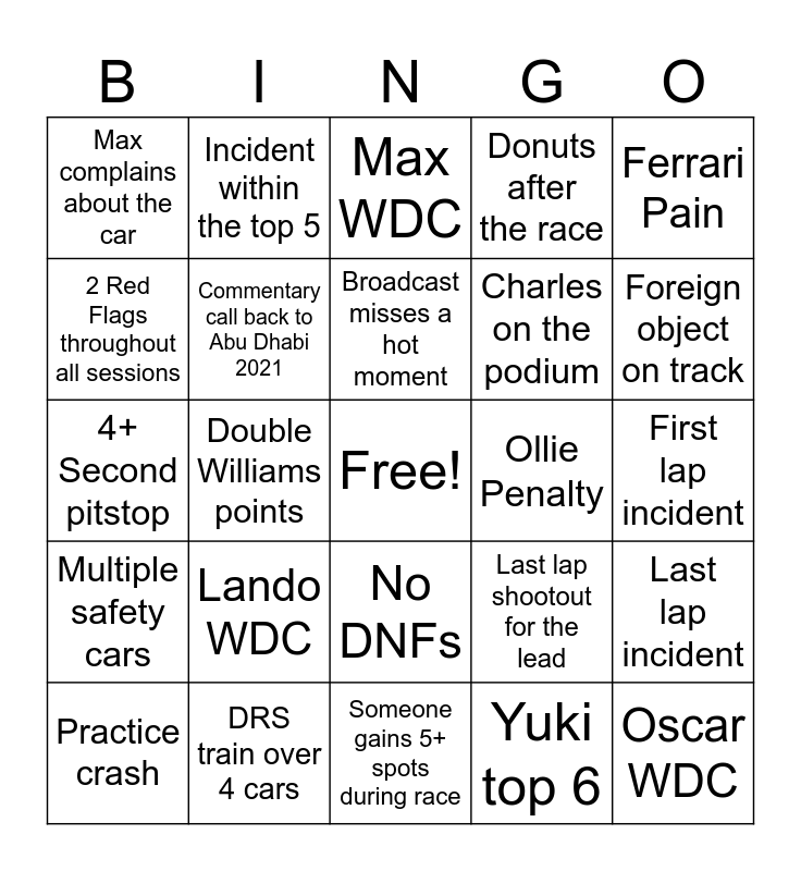 This bingo card has a free space and 36 words: Chat crashout, Non-WDC contender wins, One WDC contender DNFs, Commentary call back to Abu Dhabi 2021, Last lap shootout for the lead, Multiple safety cars, Broadcast misses a hot moment, Someone complains about Lawson, Ferrari Pain, Alpine has surprisingly good race, Double Williams points, Donuts after the race, Awkward cool down room, Ollie Penalty, Foreign object on track, Max complains about the car, Lewis on the podium, Lando WDC, Oscar WDC, Max WDC, First lap incident, Last lap incident, DRS train over 4 cars, Practice crash, Someone gains 5+ spots during race, Incident within the top 5, 4+ Second pitstop, 1 driver gets multiple penalties, Charles on the podium, 2 Red Flags throughout all sessions, FP1 Rookie incident, Leclerc Brothers moment, Yuki top 6, No DNFs, Hilarious driver radio and Alonso points (more than 1).