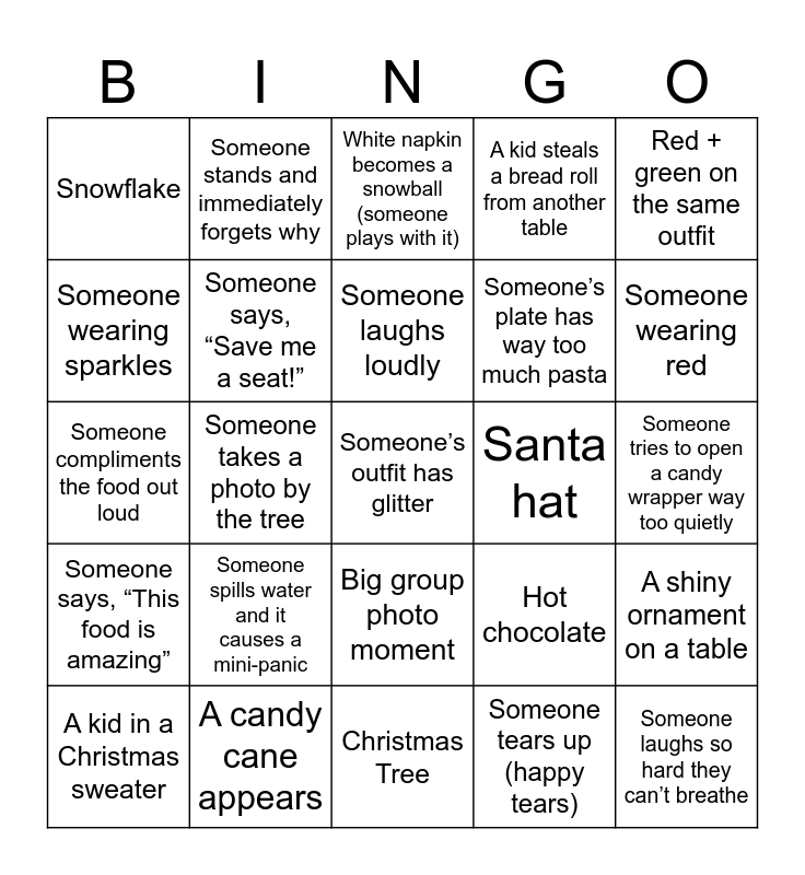 This bingo card has 96 words: Tree, Stocking, Lights, Santa hat, Gift, Ornament, Bells, Holly, Gold star, Reindeer, Candy cane, Angel, Nativity scene, Someone wearing red, Someone wearing green, Someone wearing sparkles, Someone laughs loudly, Kids running around, Someone taking a selfie, Someone sneezes, Table cheers, A couple holding hands, A worship song plays, A Bible verse is mentioned, Big group photo moment, Christmas Tree, Gingerbread man, Snowflake, Snowman, Wreath, Ornaments, Hot chocolate, A candle centerpiece flickers, Someone wearing a Christmas bow, Red + green on the same outfit, Someone sipping hot chocolate, A shiny ornament on a table, Someone jingles keys (sounds like sleigh bells), A Christmas fragrance wafts by (cinnamon or peppermint), Someone takes a photo by the tree, Someone humming a Christmas song, A kid in a Christmas sweater, Someone’s outfit has glitter, A candy cane appears, Someone says, “This food is amazing”, White napkin becomes a snowball (someone plays with it), Someone’s wearing Christmas socks, Someone gets a second dessert, A plate so full it’s a “mountain of Christmas blessing”, some says "Hope City family, how we doing tonight?”, Someone yells “Woooo!” unexpectedly, A volunteer rushes by with purpose, Someone thanks a volunteer, Someone from Abby says hi to someone from Chilliwack, People line up perfectly… then completely fall apart 😂, Someone says, “I didn’t know Hope City was this big!”, A worship leader laughs loudly, Someone compliments the décor, Someone is still trying to figure out where the bathrooms are, Someone recognizes a person they only know from Sundays and says “Oh hey… I know you!”, Someone says, “We should do this more often”, Pastor Jenni says, “Everybody say…”, Pastor Jake cracks a joke, Josiah carries some piece of sound equipment, landell carries something heavy fast, Someone hugs someone else too long, Someone says, “That message last week… wow.”, Someone says, “What’s happening in 2026?” 👀, Someone prays quietly with another person, Someone tears up (happy tears), Someone laughs so hard they can’t breathe, Someone waves across the room, Someone greets someone they’ve never met, Someone introduces their whole family, Someone says, “This feels like family.”, Someone compliments someone’s outfit, Someone takes a group photo at the table, Someone says, “Save me a seat!”, Someone drops a fork (classic), Someone’s plate has way too much pasta, A kid steals a bread roll from another table, Someone asks, “Is there more sauce?”, Someone lets out the post-meal sigh, Someone sneaks back for seconds pretending it’s their first time, Someone takes forever choosing a dessert, Someone compliments the food out loud, Someone spills water and it causes a mini-panic, Someone says, “I’m so full… but I’m still eating.”, Someone does the silent nod-laugh, Someone tries to open a candy wrapper way too quietly, Someone claps at the wrong time, Someone tells a story WAY louder than they meant to, The table does a round of “What are you thankful for?”, Someone does the awkward side-step to get past someone, Someone stands and immediately forgets why and Someone breaks into spontaneous harmony on a Christmas song.