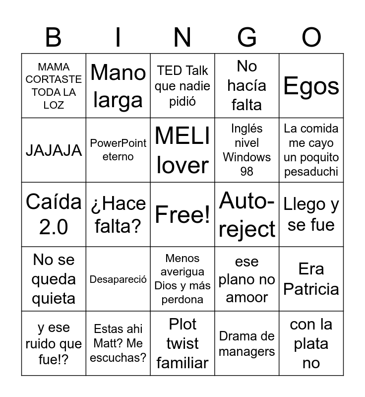 This bingo card has a free space and 24 words: Desapareció, Estas ahi Matt? Me escuchas?, MELI lover, y ese ruido que fue!?, Egos, MAMA CORTASTE TODA LA LOZ, JAJAJA, Mano larga, Auto-reject, Menos averigua Dios y más perdona, Inglés nivel Windows 98, Caída 2.0, ese plano no amoor, Era Patricia, PowerPoint eterno, Drama de managers, Llego y se fue, TED Talk que nadie pidió, La comida me cayo un poquito pesaduchi, ¿Hace falta?, con la plata no, No se queda quieta, No hacía falta and Plot twist familiar.
