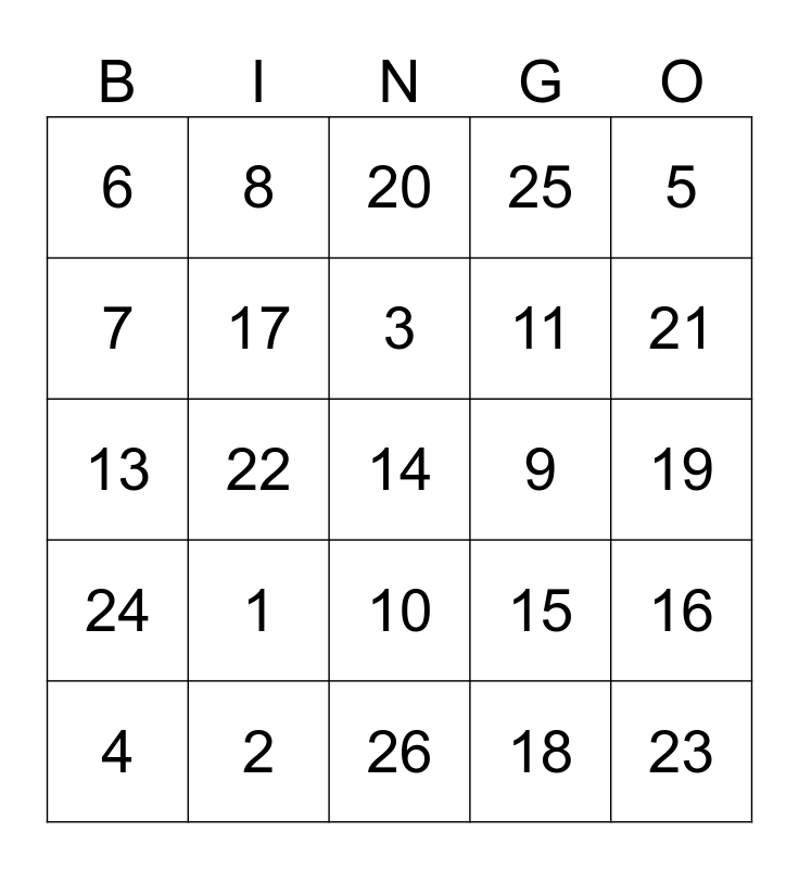 This bingo card has a free space and 24 words: 1, 2, 3, 4, 5, 6, 7, 8, 9, 10, 11, 13, 15, 16, 17, 18, 19, 20, 21, 22, 23, 24, 25 and 26.