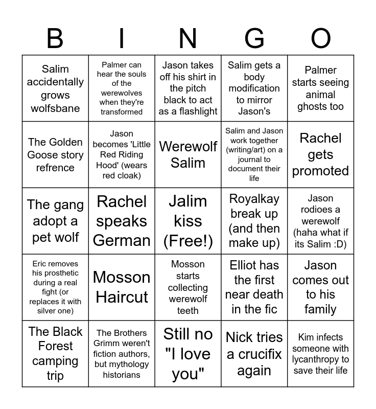 This bingo card has a free space and 24 words: Mosson Haircut, The Brothers Grimm weren't fiction authors, but mythology historians, Werewolf Salim, The Black Forest camping trip, Palmer starts seeing animal ghosts too, Salim accidentally grows wolfsbane, The Golden Goose story refrence, Palmer can hear the souls of the werewolves when they're transformed, Royalkay break up (and then make up), Mosson starts collecting werewolf teeth, Salim and Jason work together (writing/art) on a journal to document their life, The gang adopt a pet wolf, Elliot has the first near death in the fic, Jason comes out to his family, Jason becomes 'Little Red Riding Hood' (wears red cloak), Nick tries a crucifix again, Jason rodioes a werewolf (haha what if its Salim :D), Jason takes off his shirt in the pitch black to act as a flashlight, Rachel gets promoted, Rachel speaks German, Kim infects someone with lycanthropy to save their life, Eric removes his prosthetic during a real fight (or replaces it with silver one), Salim gets a body modification to mirror Jason's and Still no "I love you".