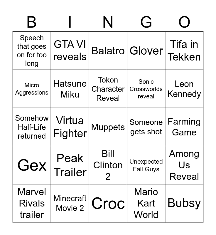 This bingo card has a free space and 24 words: Peak Trailer, Minecraft Movie 2, Tokon Character Reveal, Marvel Rivals trailer, Tifa in Tekken, Speech that goes on for too long, Micro Aggressions, GTA VI reveals, Someone gets shot, Bill Clinton 2, Sonic Crossworlds reveal, Somehow Half-Life returned, Unexpected Fall Guys, Among Us Reveal, Hatsune Miku, Mario Kart World, Farming Game, Balatro, Leon Kennedy, Virtua Fighter, Bubsy, Gex, Glover and Croc.