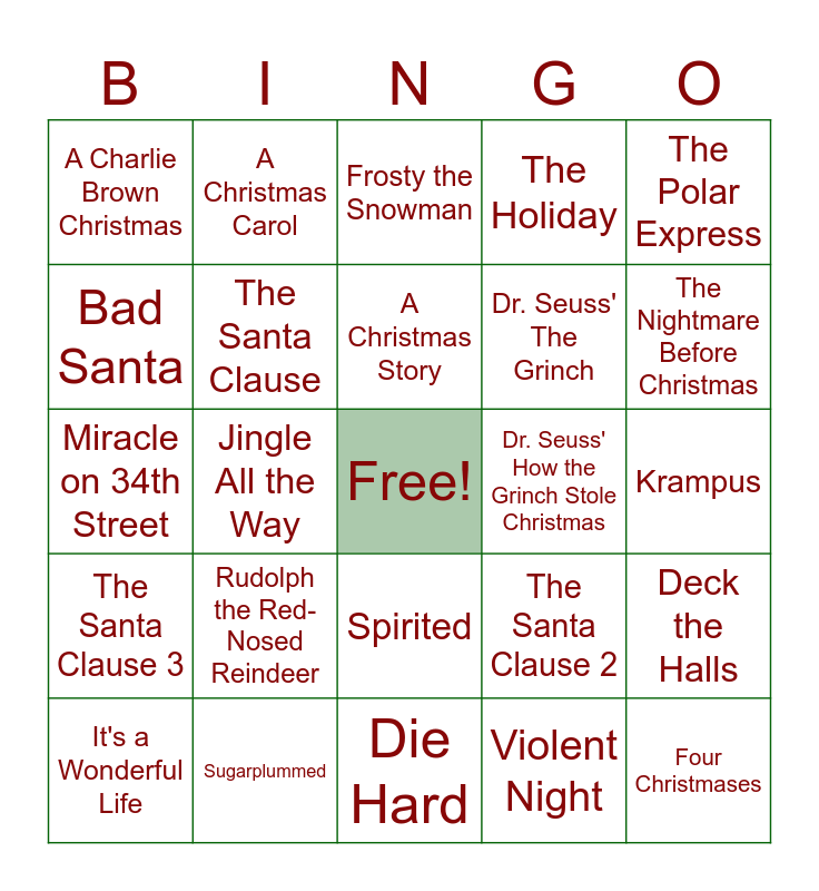 This bingo card has a free space and 36 words: Home Alone, Elf, National Lampoon's Christmas Vacation, The Santa Clause, The Santa Clause 2, The Santa Clause 3, A Christmas Story, Love Actually, The Polar Express, Christmas with the Kranks, Jingle All the Way, The Holiday, The Muppet Christmas Carol, Dr. Seuss' How the Grinch Stole Christmas, The Nightmare Before Christmas, A Charlie Brown Christmas, A Year Without Santa Clause, Rudolph the Red-Nosed Reindeer, Four Christmases, Frosty the Snowman, Krampus, Deck the Halls, Sugarplummed, It's a Wonderful Life, Die Hard, A Christmas Carol, Miracle on 34th Street, Klaus, Dr. Seuss' The Grinch, Bad Santa, How the Grinch Stole Christmas (1967), A Very Jonas Christmas Movie, Violent Night, Spirited, The Night Before and Noelle.