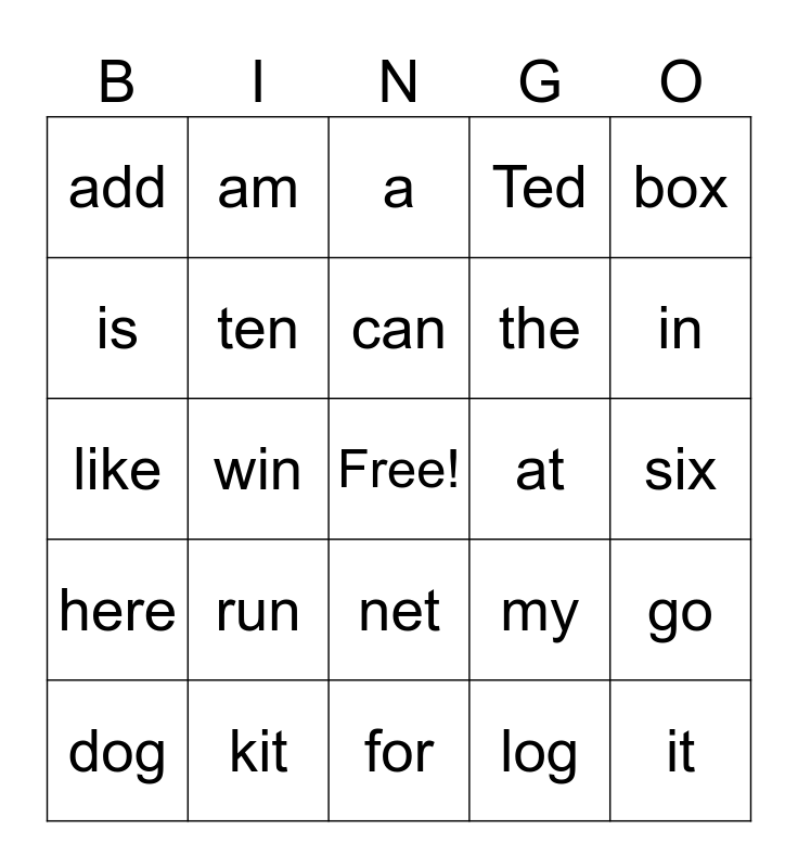 This bingo card has a free space and 27 words: my, in, the, for, is, a, am, here, at, go, like, Ted, dog, kit, in, hug, ten, can, run, add, six, log, win, it, net, box and and.