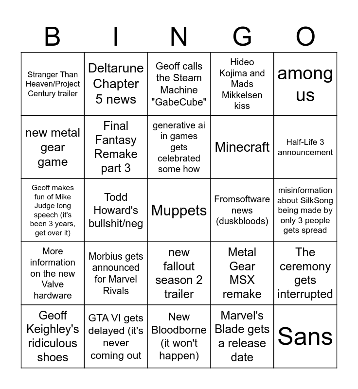 This bingo card has a free space and 24 words: Morbius gets announced for Marvel Rivals, GTA VI gets delayed (it's never coming out, generative ai in games gets celebrated some how, Geoff Keighley's ridiculous shoes, among us, Stranger Than Heaven/Project Century trailer, new metal gear game, Deltarune Chapter 5 news, Fromsoftware news (duskbloods), new fallout season 2 trailer, Minecraft, Geoff makes fun of Mike Judge long speech (it's been 3 years, get over it), Metal Gear MSX remake, The ceremony gets interrupted, Final Fantasy Remake part 3, Marvel's Blade gets a release date, misinformation about SilkSong being made by only 3 people gets spread, Geoff calls the Steam Machine "GabeCube", Half-Life 3 announcement, Todd Howard's bullshit/neg, Sans, More information on the new Valve hardware, Hideo Kojima and Mads Mikkelsen kiss and New Bloodborne (it won't happen).