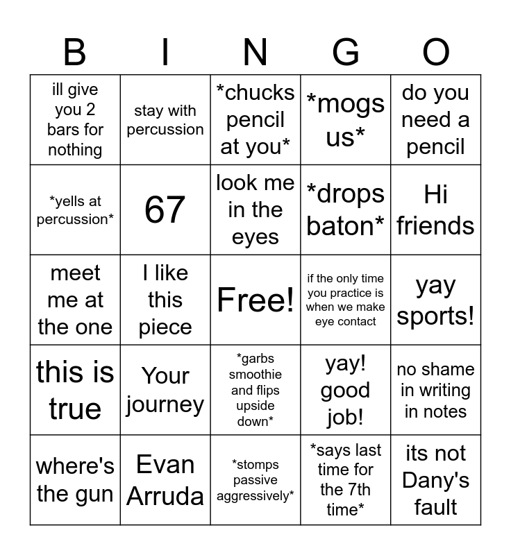 This bingo card has a free space and 24 words: Your journey, Evan Arruda, look me in the eyes, where's the gun, do you need a pencil, ill give you 2 bars for nothing, *yells at percussion*, stay with percussion, if the only time you practice is when we make eye contact, *garbs smoothie and flips upside down*, *drops baton*, meet me at the one, yay! good job!, no shame in writing in notes, 67, *says last time for the 7th time*, yay sports!, *chucks pencil at you*, Hi friends, I like this piece, its not Dany's fault, this is true, *mogs us* and *stomps passive aggressively*.