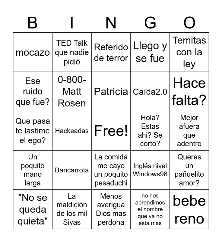 This bingo card has a free space and 24 words: Bancarrota, La maldición de los mil Sivas, Patricia, "No se queda quieta", Temitas con la ley, mocazo, Ese ruido que fue?, TED Talk que nadie pidió, Hola? Estas ahi? Se corto?, La comida me cayo un poquito pesaduchi, Caída2.0, Que pasa te lastime el ego?, Inglés nivel Windows98, Queres un pañuelito amor?, 0-800- Matt Rosen, no nos aprendimos el nombre que ya no esta mas, Mejor afuera que adentro, Referido de terror, Hace falta?, Hackeadas, bebe reno, Un poquito mano larga, Llego y se fue and Menos averigua Dios mas perdona.