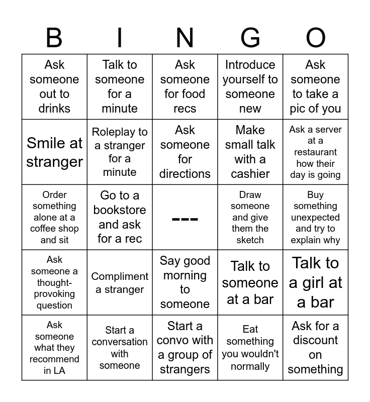 This bingo card has a free space and 24 words: Compliment a stranger, Start a conversation with someone, Ask someone for directions, Ask someone what they recommend in LA, Ask someone to take a pic of you, Ask someone out to drinks, Smile at stranger, Talk to someone for a minute, Draw someone and give them the sketch, Say good morning to someone, Make small talk with a cashier, Order something alone at a coffee shop and sit, Talk to someone at a bar, Talk to a girl at a bar, Roleplay to a stranger for a minute, Eat something you wouldn't normally, Buy something unexpected and try to explain why, Ask someone for food recs, Ask a server at a restaurant how their day is going, Go to a bookstore and ask for a rec, Ask for a discount on something, Ask someone a thought-provoking question, Introduce yourself to someone new and Start a convo with a group of strangers.