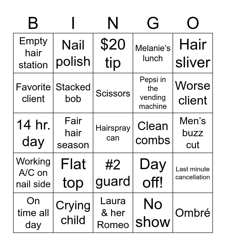 This bingo card has 25 words: Flat top, Laura & her Romeo, Scissors, On time all day, Hair sliver, Empty hair station, Favorite client, Nail polish, Clean combs, #2 guard, Pepsi in the vending machine, 14 hr. day, Day off!, Last minute cancellation, Stacked bob, Ombré, Men’s buzz cut, $20 tip, Worse client, Fair hair season, Hairspray can, Crying child, Working A/C on nail side, Melanie’s lunch and No show.