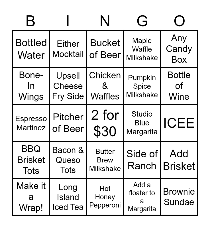This bingo card has 25 words: Bacon & Queso Tots, Hot Honey Pepperoni, Chicken & Waffles, Make it a Wrap!, Any Candy Box, Bottled Water, Bone-In Wings, Either Mocktail, Studio Blue Margarita, Butter Brew Milkshake, Pumpkin Spice Milkshake, Espresso Martinez, Side of Ranch, Add Brisket, Upsell Cheese Fry Side, Brownie Sundae, ICEE, Bucket of Beer, Bottle of Wine, Pitcher of Beer, 2 for $30, Long Island Iced Tea, BBQ Brisket Tots, Maple Waffle Milkshake and Add a floater to a Margarita.