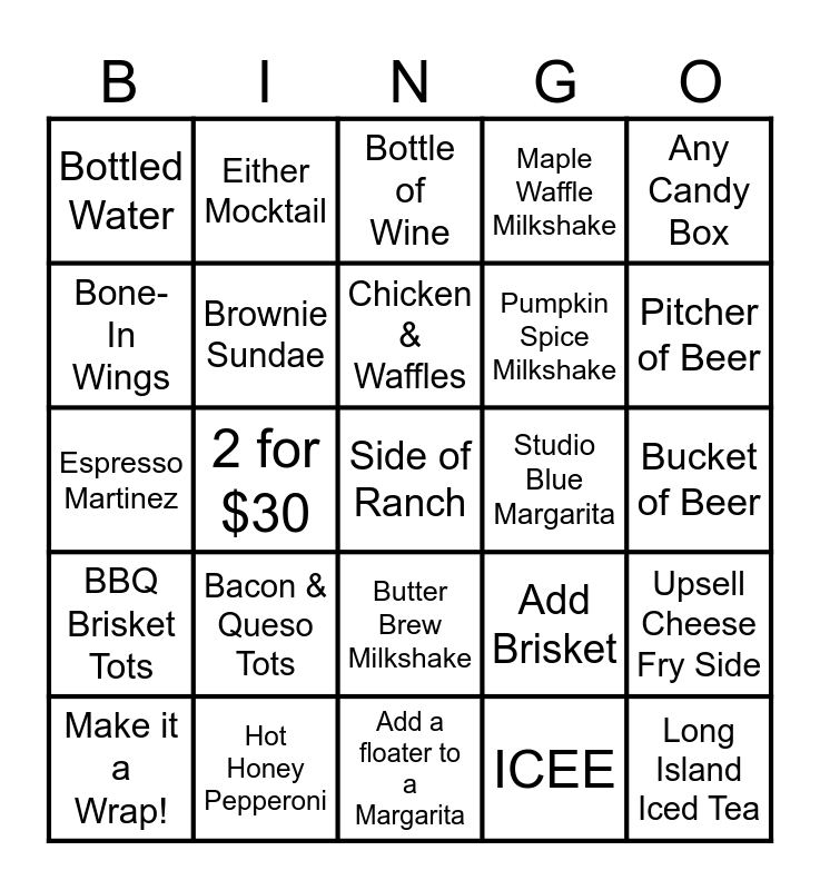 This bingo card has a free space and 24 words: Bacon & Queso Tots, Hot Honey Pepperoni, Chicken & Waffles, Make it a Wrap!, Any Candy Box, Bottled Water, Bone-In Wings, Either Mocktail, Studio Blue Margarita, Butter Brew Milkshake, Pumpkin Spice Milkshake, Espresso Martinez, Add Brisket, Upsell Cheese Fry Side, Brownie Sundae, ICEE, Bucket of Beer, Bottle of Wine, Pitcher of Beer, 2 for $30, Long Island Iced Tea, BBQ Brisket Tots, Maple Waffle Milkshake and Add a floater to a Margarita.
