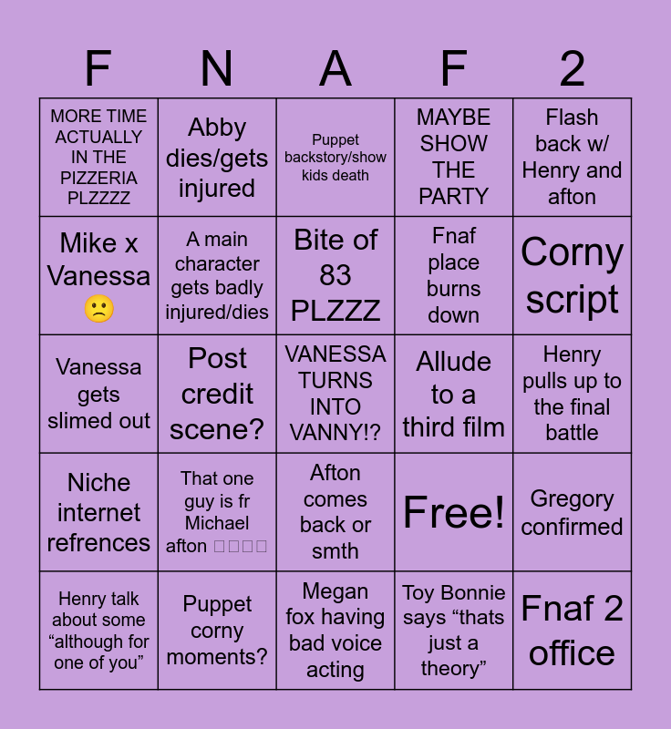 This bingo card has 25 words: That one guy is fr Michael afton , Megan fox having bad voice acting, Bite of 83 PLZZZ, Henry talk about some “although for one of you”, Flash back w/ Henry and afton, MORE TIME ACTUALLY IN THE PIZZERIA PLZZZZ, Mike x Vanessa 🙁, Abby dies/gets injured, Allude to a third film, Afton comes back or smth, Fnaf place burns down, Vanessa gets slimed out, Free!, Gregory confirmed, A main character gets badly injured/dies, Fnaf 2 office, Henry pulls up to the final battle, Puppet backstory/show kids death, Corny script, Post credit scene?, VANESSA TURNS INTO VANNY!?, Puppet corny moments?, Niche internet refrences, MAYBE SHOW THE PARTY and Toy Bonnie says “thats just a theory”.