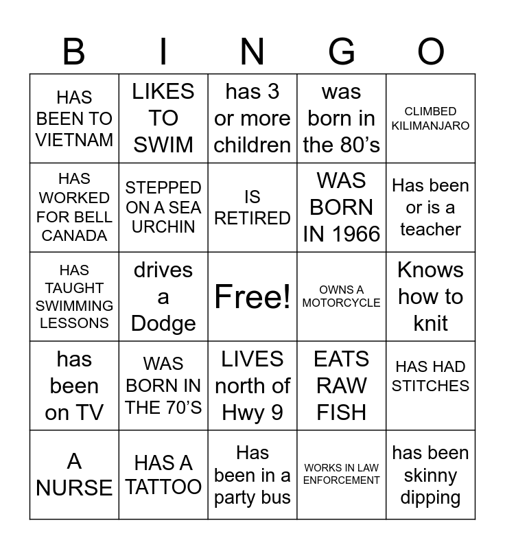 This bingo card has a free space and 24 words: WAS BORN IN THE 70’S, HAS A TATTOO, IS RETIRED, A NURSE, CLIMBED KILIMANJARO, HAS BEEN TO VIETNAM, HAS WORKED FOR BELL CANADA, LIKES TO SWIM, OWNS A MOTORCYCLE, LIVES north of Hwy 9, WAS BORN IN 1966, HAS TAUGHT SWIMMING LESSONS, EATS RAW FISH, HAS HAD STITCHES, STEPPED ON A SEA URCHIN, WORKS IN LAW ENFORCEMENT, Knows how to knit, has 3 or more children, Has been or is a teacher, drives a Dodge, has been skinny dipping, has been on TV, was born in the 80’s and Has been in a party bus.