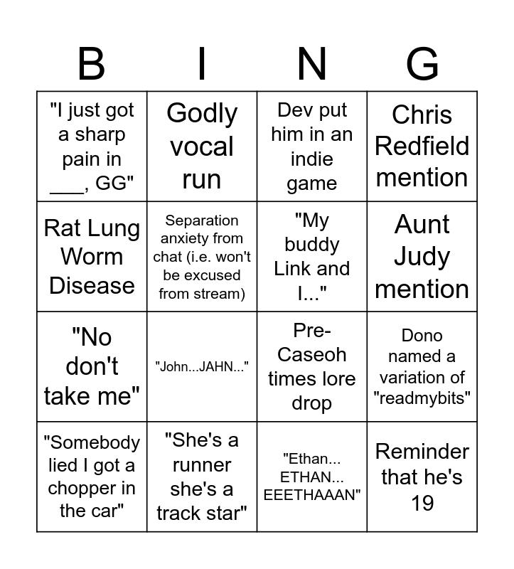 This bingo card has 17 words: "Somebody lied I got a chopper in the car", "She's a runner she's a track star", Dev put him in an indie game, Chris Redfield mention, "No don't take me", Separation anxiety from chat (i.e. won't be excused from stream), Pre-Caseoh times lore drop, Aunt Judy mention, Rat Lung Worm Disease, "John...JAHN...", "Ethan... ETHAN... EEETHAAAN", Dono named a variation of "readmybits", "I just got a sharp pain in ___, GG", Godly vocal run, "My buddy Link and I...", Reminder that he's 19 and "Kiss me on my hot mouth, I'm feelin romantical".