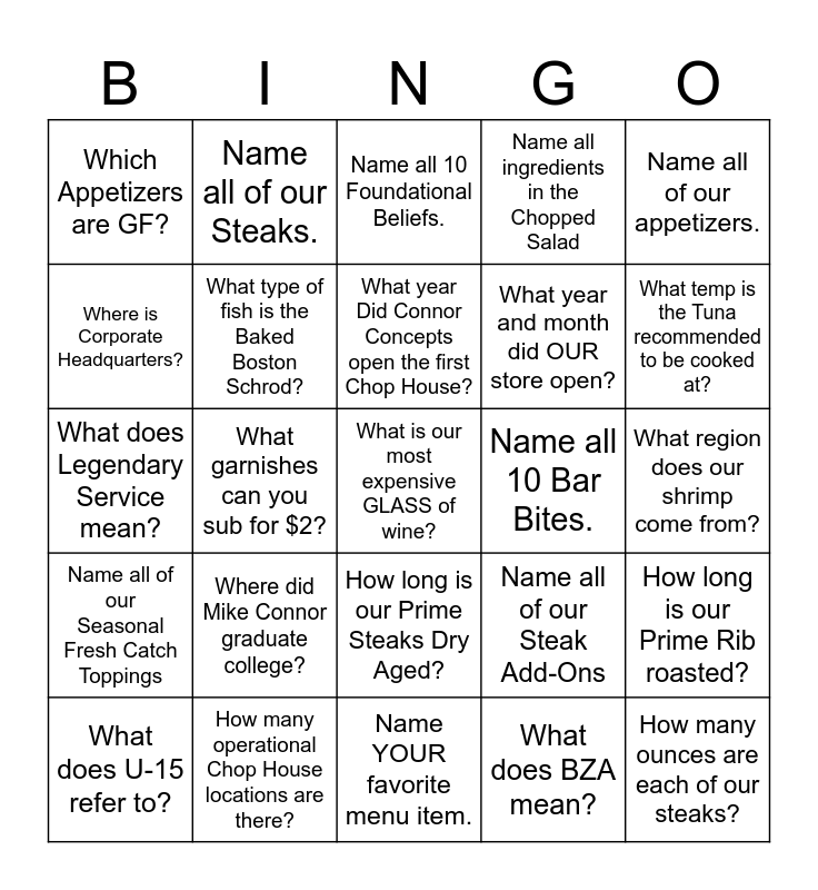 This bingo card has a free space and 24 words: Where did Mike Connor graduate college?, How many operational Chop House locations are there?, What year Did Connor Concepts open the first Chop House?, What does U-15 refer to?, Name all of our appetizers., Which Appetizers are GF?, Where is Corporate Headquarters?, Name all of our Steaks., Name all 10 Bar Bites., How long is our Prime Steaks Dry Aged?, What year and month did OUR store open?, What does Legendary Service mean?, Name all of our Steak Add-Ons, How long is our Prime Rib roasted?, What type of fish is the Baked Boston Schrod?, What does BZA mean?, What region does our shrimp come from?, Name all 10 Foundational Beliefs., What temp is the Tuna recommended to be cooked at?, What garnishes can you sub for $2?, How many ounces are each of our steaks?, Name all of our Seasonal Fresh Catch Toppings, Name all ingredients in the Chopped Salad and Name YOUR favorite menu item..