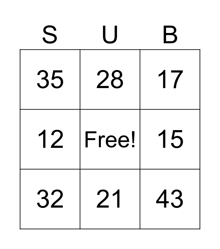 This bingo card has a free space and 8 words: 15, 17, 28, 32, 35, 43, 12 and 21.