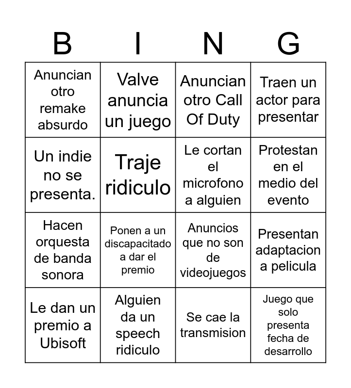 This bingo card has 16 words: Le dan un premio a Ubisoft, Alguien da un speech ridiculo, Anuncian otro Call Of Duty, Traen un actor para presentar, Un indie no se presenta., Valve anuncia un juego, Anuncios que no son de videojuegos, Presentan adaptacion a pelicula, Anuncian otro remake absurdo, Traje ridiculo, Se cae la transmision, Protestan en el medio del evento, Hacen orquesta de banda sonora, Ponen a un discapacitado a dar el premio, Le cortan el microfono a alguien and Juego que solo presenta fecha de desarrollo.