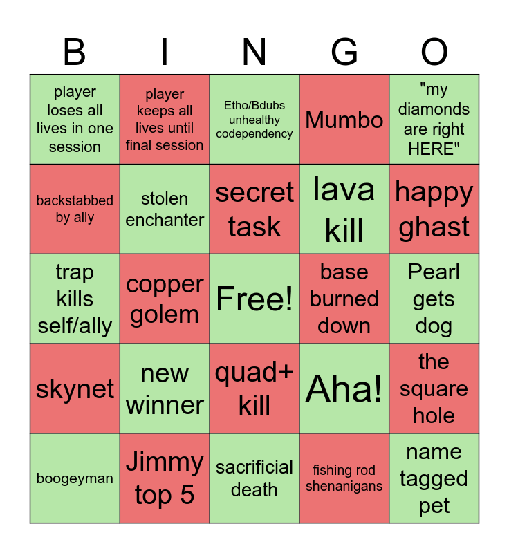 This bingo card has a free space and 24 words: new winner, Jimmy top 5, secret task, boogeyman, "my diamonds are right HERE", player loses all lives in one session, backstabbed by ally, player keeps all lives until final session, base burned down, quad+ kill, lava kill, trap kills self/ally, Aha!, the square hole, stolen enchanter, fishing rod shenanigans, Pearl gets dog, Etho/Bdubs unhealthy codependency, happy ghast, copper golem, name tagged pet, skynet, Mumbo and sacrificial death.