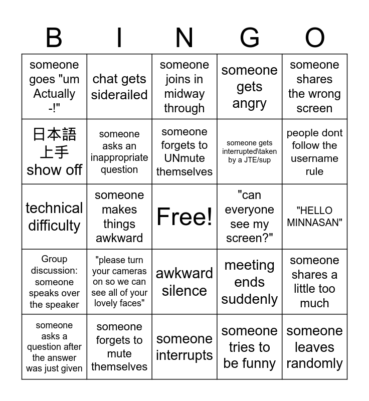 This bingo card has a free space and 24 words: "please turn your cameras on so we can see all of your lovely faces", someone forgets to mute themselves, someone forgets to UNmute themselves, someone asks a question after the answer was just given, someone shares the wrong screen, someone goes "um Actually -!", 日本語上手 show off, chat gets siderailed, "can everyone see my screen?", awkward silence, someone gets interrupted\taken by a JTE/sup, technical difficulty, meeting ends suddenly, someone shares a little too much, someone asks an inappropriate question, someone tries to be funny, "HELLO MINNASAN", someone joins in midway through, people dont follow the username rule, someone makes things awkward, someone leaves randomly, Group discussion: someone speaks over the speaker, someone gets angry and someone interrupts.