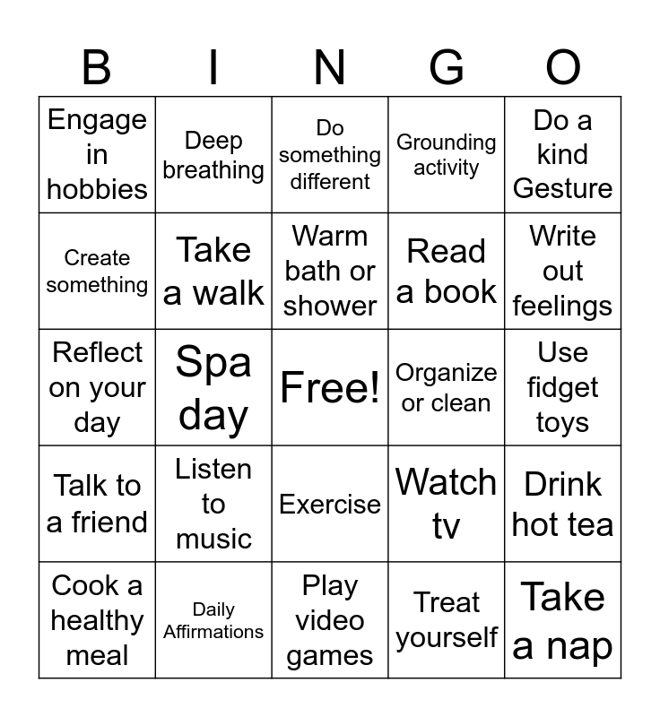This bingo card has a free space and 24 words: Listen to music, Daily Affirmations, Warm bath or shower, Cook a healthy meal, Do a kind Gesture, Engage in hobbies, Create something, Deep breathing, Organize or clean, Exercise, Read a book, Reflect on your day, Watch tv, Drink hot tea, Take a walk, Treat yourself, Use fidget toys, Do something different, Write out feelings, Spa day, Take a nap, Talk to a friend, Grounding activity and Play video games.