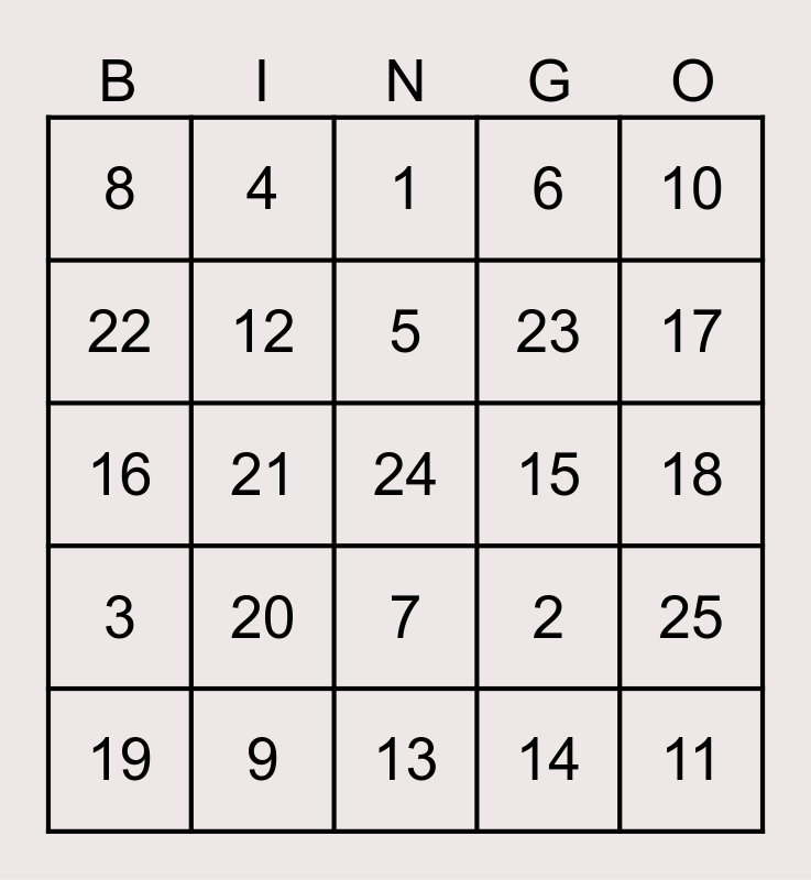 This bingo card has 25 words: 20, 13, 5, 19, 10, 8, 22, 4, 15, 7, 23, 16, 2, 25, 12, 11, 18, 1, 17, 21, 24, 9, 3, 6 and 14.