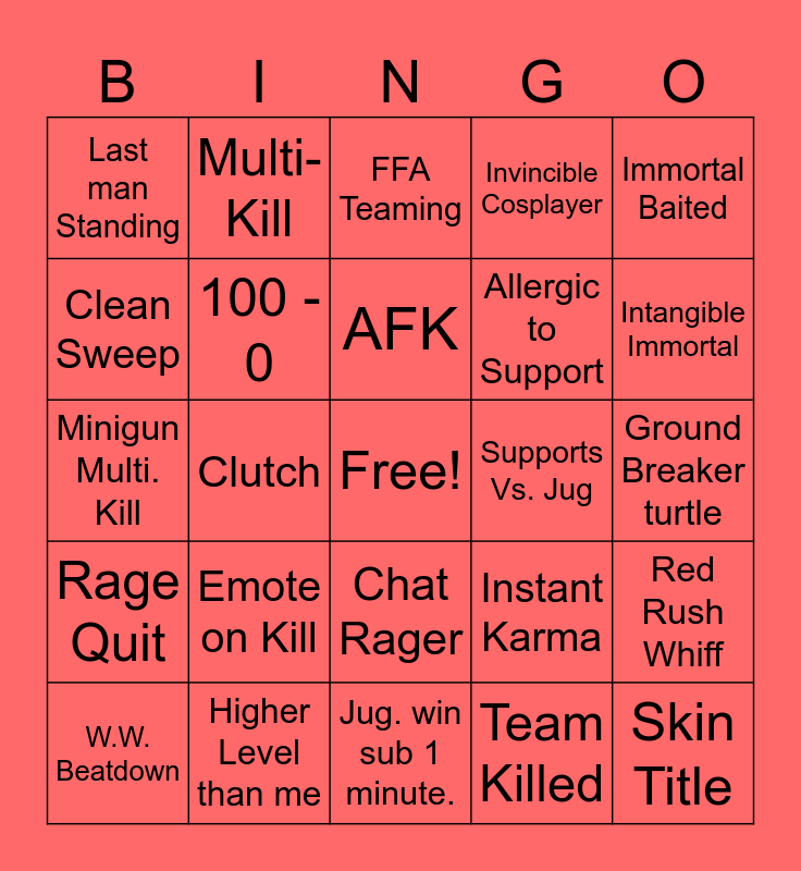 This bingo card has a free space and 32 words: Team Killed, Ping Savior, Clutch, Sub 100 DMG Jug., Rage Quit, 100 - 0, Immortal Baited, Red Rush Whiff, Multi-Kill, Lore-accurate Death, AFK, FFA Teaming, Powerplex Wet dream, Hiding Support, Supports Vs. Jug, Immortal Revive Sub 30., W.W. Beatdown, Minigun Multi. Kill, Chat Rager, Emote on Kill, Instant Karma, Zone Finisher, Ground Breaker turtle, Higher Level than me, Skin Title, Invincible Cosplayer, Allergic to Support, Clean Sweep, Last man Standing, Jug. win sub 1 minute., Spin Skin Jug. and Intangible Immortal.