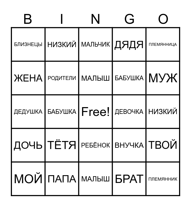 This bingo card has a free space and 58 words: МАМА, ПАПА, СЫН, ДОЧЬ, БРАТ, СЕСТРА, РОДИТЕЛИ, ДЕТИ, БАБУШКА, ДЕДЕУШКА, ДЯДЯ, ТЁТЯ, ВНУК, ВНУЧКА, СЕМЬЯ, БЛИЗНЕЦЫ, ПЛЕМЯННИК, ПЛЕМЯННИЦА, РЕБЁНОК, МАЛЫШ, ДЕВОЧКА, МАЛЬЧИК, МОЙ, ТВОЙ, ВЫСОКИЙ, НИЗКИЙ, РАДОСТНЫЙ, ЖЕНА, МУЖ, МАМА, ПАПА, СЫН, ДОЧЬ, БРАТ, СЕСТРА, РОДИТЕЛИ, ДЕТИ, БАБУШКА, ДЕДУШКА, ДЯДЯ, ТЁТЯ, ВНУК, ВНУЧКА, СЕМЬЯ, БЛИЗНЕЦЫ, ПЛЕМЯННИК, ПЛЕМЯННИЦА, РЕБЁНОК, МАЛЫШ, ДЕВОЧКА, МАЛЬЧИК, МОЙ, ТВОЙ, ВЫСОКИЙ, НИЗКИЙ, РАДОСТНЫЙ, ЖЕНА and МУЖ.