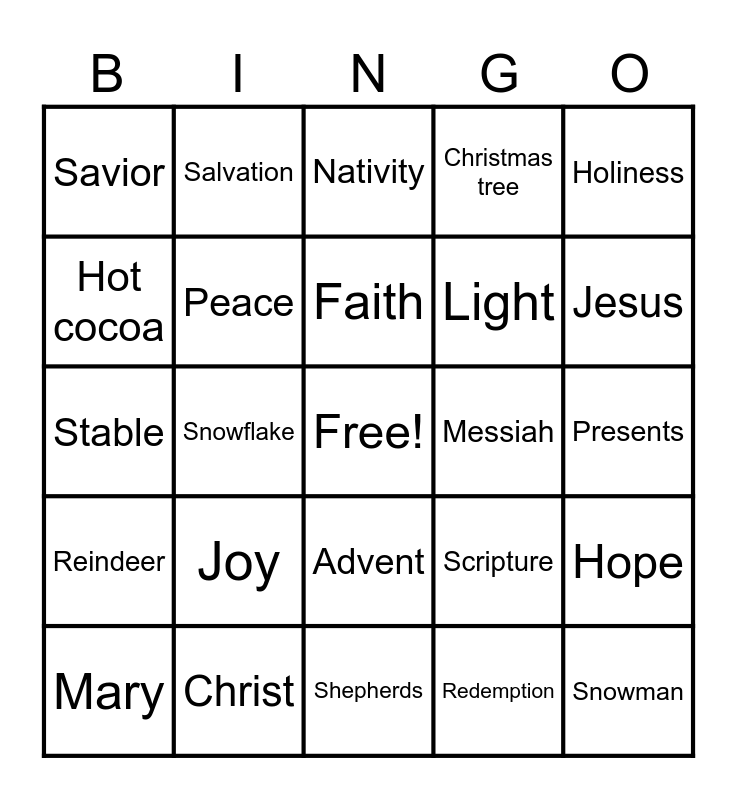 This bingo card has a free space and 38 words: Rejoice, Worship, Carols, Peace, Hope, Joy, Faith, Fellowship, Holiness, Light, Snowflake, Christmas tree, Snowman, Presents, Hot cocoa, Reindeer, Cookies, Nativity, Bethlehem, Messiah, Savior, Christ, Jesus, Mary, Joseph, Shepherds, Angels, Star, Incarnation, Immanuel, Gospel, Advent, Redemption, Salvation, Prophecy, Scripture, Stable and Glory.