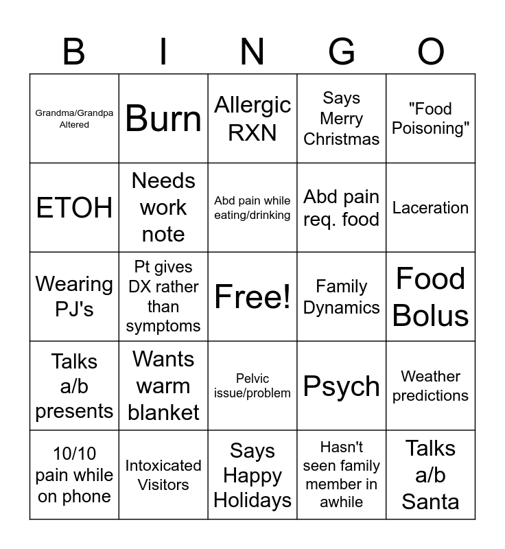 This bingo card has a free space and 24 words: Wants warm blanket, Intoxicated Visitors, Abd pain while eating/drinking, 10/10 pain while on phone, "Food Poisoning", Grandma/Grandpa Altered, ETOH, Burn, Family Dynamics, Pelvic issue/problem, Abd pain req. food, Wearing PJ's, Psych, Weather predictions, Needs work note, Hasn't seen family member in awhile, Food Bolus, Allergic RXN, Laceration, Pt gives DX rather than symptoms, Talks a/b Santa, Talks a/b presents, Says Merry Christmas and Says Happy Holidays.