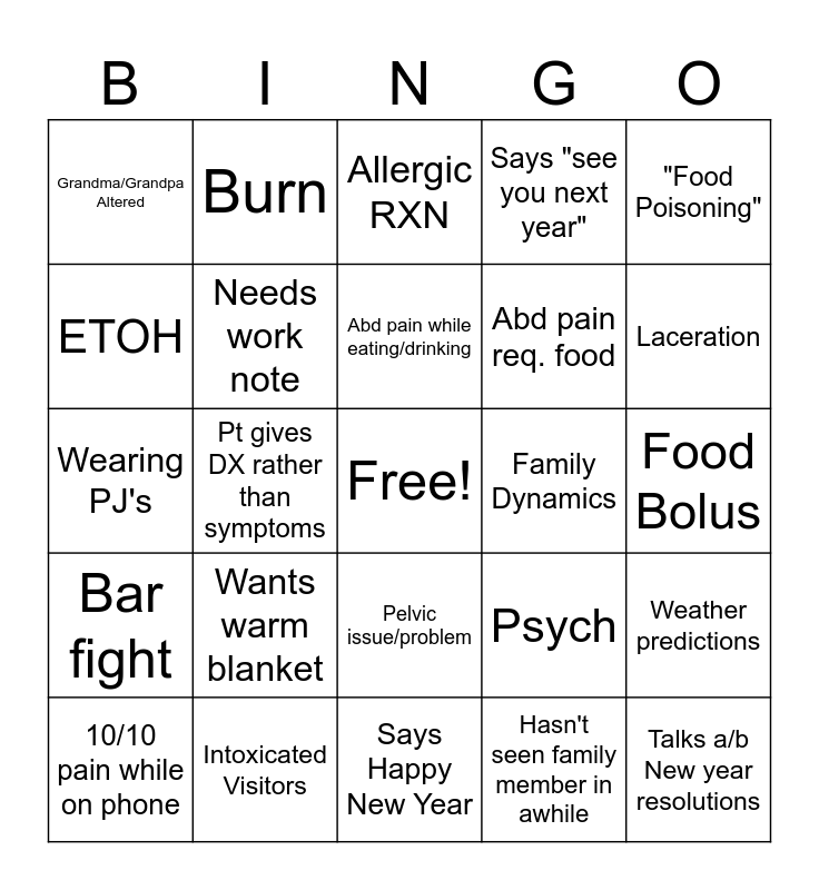 This bingo card has a free space and 24 words: Wants warm blanket, Intoxicated Visitors, Abd pain while eating/drinking, 10/10 pain while on phone, "Food Poisoning", Grandma/Grandpa Altered, ETOH, Burn, Family Dynamics, Pelvic issue/problem, Abd pain req. food, Wearing PJ's, Psych, Weather predictions, Needs work note, Hasn't seen family member in awhile, Food Bolus, Allergic RXN, Laceration, Pt gives DX rather than symptoms, Talks a/b New year resolutions, Bar fight, Says "see you next year" and Says Happy New Year.