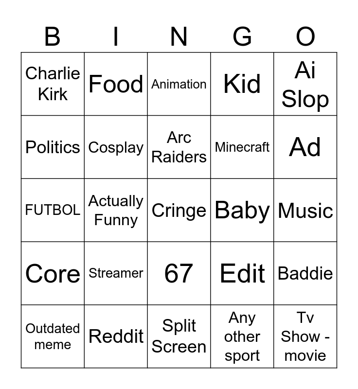 This bingo card has a free space and 24 words: Streamer, Reddit, Arc Raiders, Outdated meme, Ai Slop, Charlie Kirk, Politics, Food, Baby, 67, Minecraft, FUTBOL, Edit, Baddie, Cosplay, Any other sport, Music, Animation, Ad, Actually Funny, Tv Show - movie, Core, Kid and Split Screen.