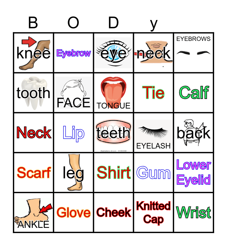 This bingo card has 30 images, a free space and 79 words: fingers, feet, eye, arm, mouth, tummy, shoulders, foot, ear, head, hair, elbow, neck, knee, hand, tooth, nose, leg, CHEST, back, toes, EYEBROWS, Neck, TONGUE, FACE, Waist, Nose, Hip, Thigh, Buttock, Calf, STOMACH, Cheek, Heel, ANKLE, EYELASH, PALM, FINGERNAIL, CHIN, Wrist, Thumb, Forefinger, Middle Finger, Ring Finger, Little Finger, Eyebrow, Iris, Pupil, White of the Eye, Upper eyelid, Lower Eyelid, Lip, Gum, Vest, Ribbon, Short sleeved Shirt, Skirt, Sock Loafer, Blazer, Shirt, Tie, Pants, Leather Shoe, Dress, Bracelet, Handkerchief, Mule, Long sleeved shirt, Down Vest, Scarf, Glove, Necklace, Straw Hat, Cardigan, Tote Bag, Knitted Cap, Jeans, Sneakers and Backpack.